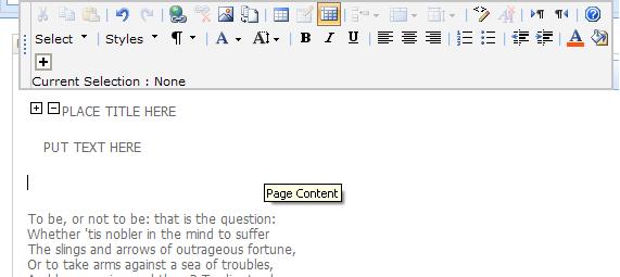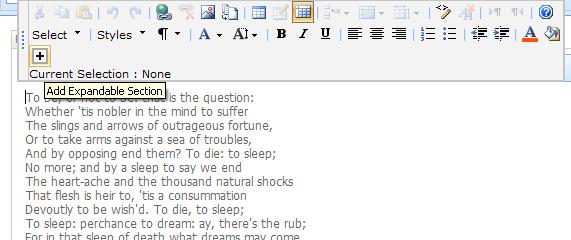 Further, each of my sections need a unique id to match up which Plus icon is clicked to which <div> is expanded etc. It's probably overkill to use a GUID as the id so you could slim this down. Anyway I added these utility functions; } } Finally, I need to insert the HTML (with unique GUID) that will be acted upon by my javascript. This is done inside TestButtonOnClick(); //get the document that is being edited //if nothing is being edited quit //get the selected text //get a unique id for this section //put it all together //Put it into the document rngSelection.pasteHTML(htmlString); //restore the button state (make it clickable again) RTE_RestoreSelection(strBaseElementID); } All this work gives me an Editor Button that looks like this;